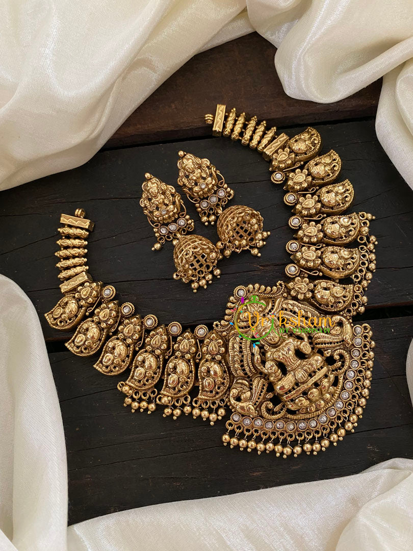 White Stone Lakshmi Pendant Short Neckpiece -Intricately Designed Temple Choker with Lakshmi idol pendant, peacocks and pearls; comes with matching ear hangings.