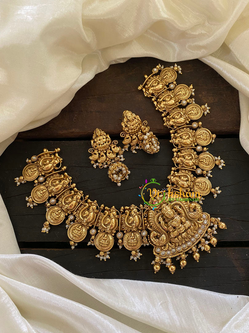 Gold Look Alike Lakshmi Pendant Short Neckpiece - Temple neckpiece with Lakshmi idol pendant,comes with matching ear hangings. Gold bead and Pearl Finish.