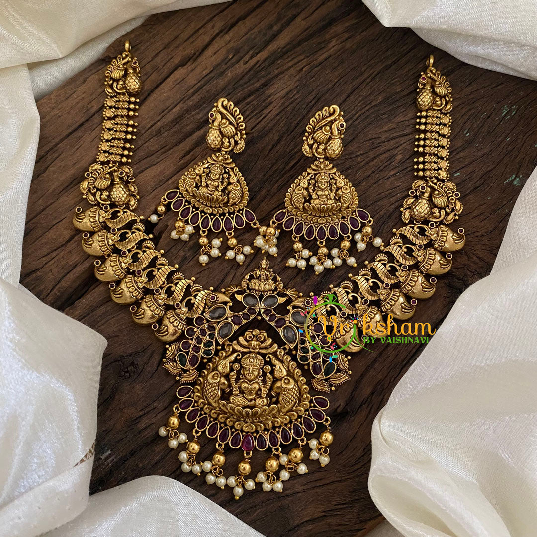 Gold Look Alike Lakshmi Pendant Short Neckpiece- premium quality polish and imitation stones neckpiece, comes with matching earrings. Gold bead finish.