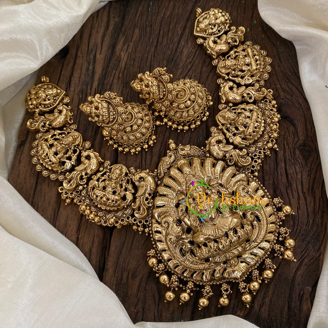 Gold Look Alike Lakshmi Pendant Short Neckpiece- premium quality polish and NO stones neckpiece, comes with matching earrings. Gold bead finish.