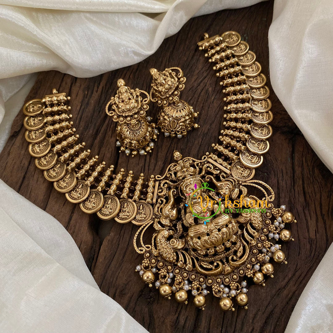 Gold Look Alike Lakshmi Pendant Short Neckpiece-Coin Style-Gold bead and pearl-G9629
