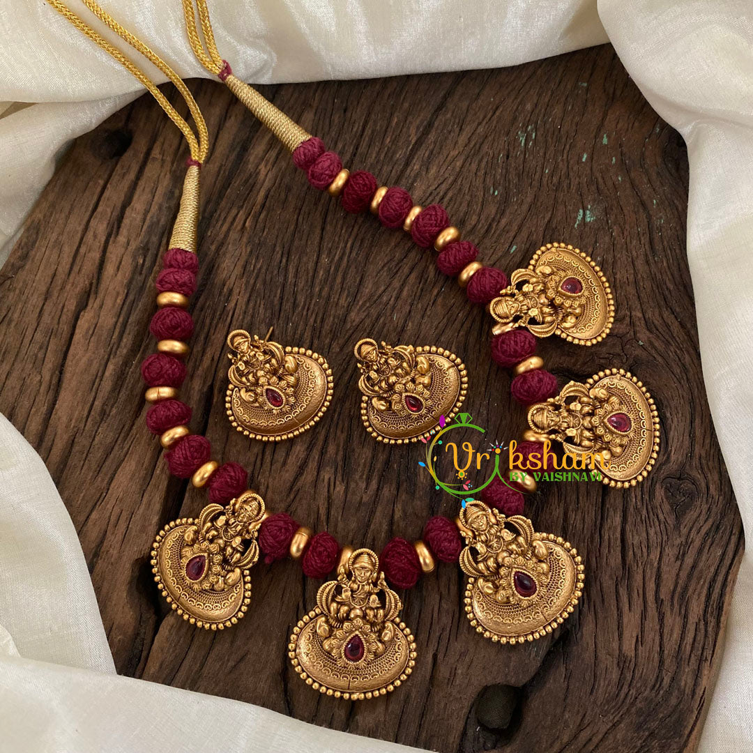 Red Thread Lakshmi Pendant Short Neckpiece-Single -G9610- premium quality polish and imitation stones neckpiece, comes with matching earrings. Gold bead finish.
