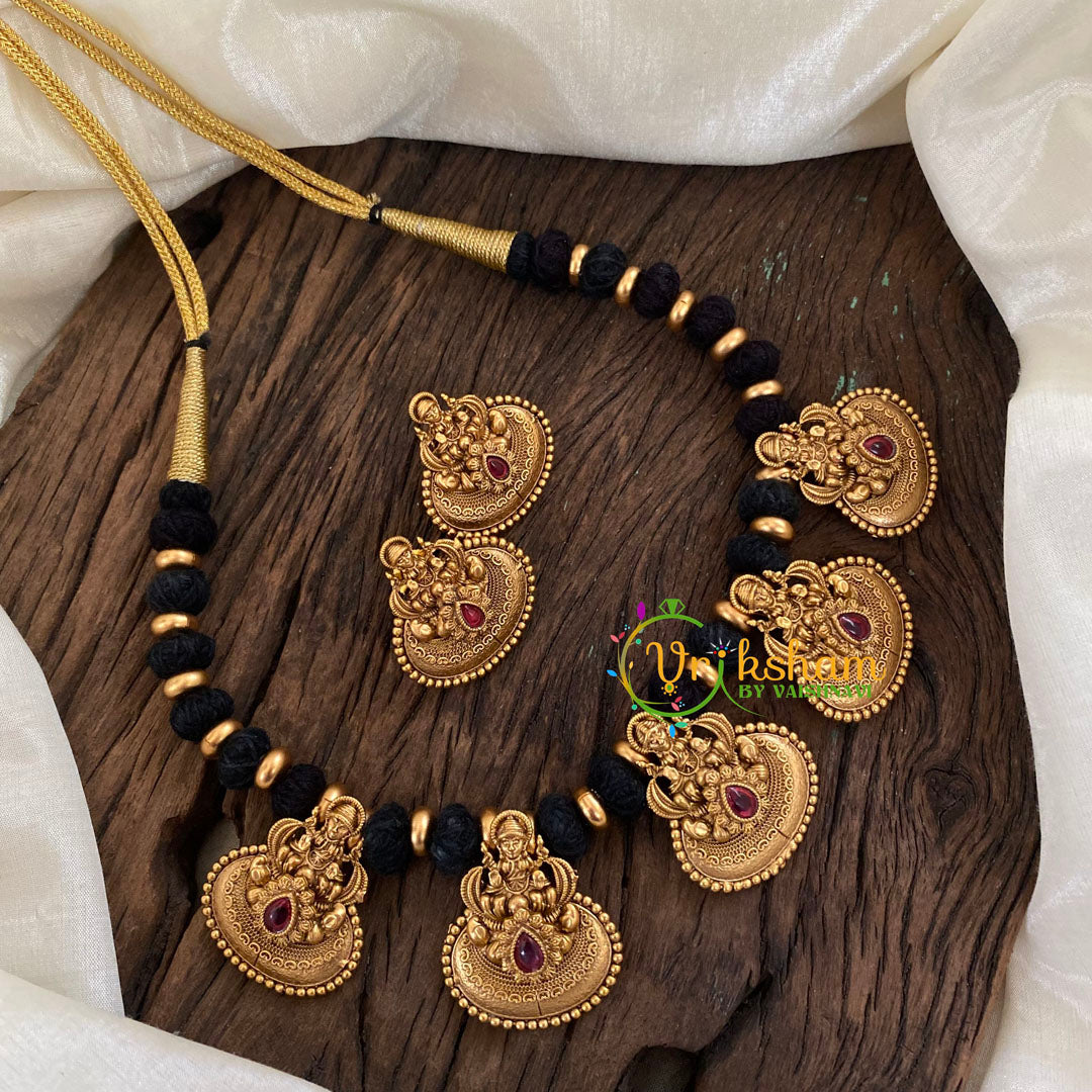 Black Thread Lakshmi Pendant Short Neckpiece-Single -G9610- premium quality polish and imitation stones neckpiece, comes with matching earrings. Gold bead finish.