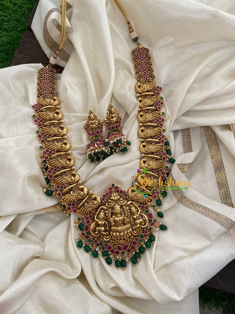 Premium Lakshmi Temple Haram Long Neckpiece -Intricately Designed Temple haram with Lakshmi idol, peacocks and flowers, comes with matching ear hangings. Green bead Finish.