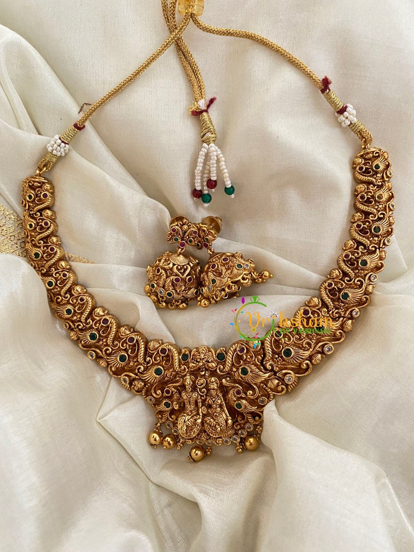 Premium Vishnu Lakshmi Temple Short Neckpiece-Intricately Designed Temple Choker with Lakshmi idol, peacocks arranged with Peacock pattern, Gold Ghungroo Finish. Comes with matching jhumkas