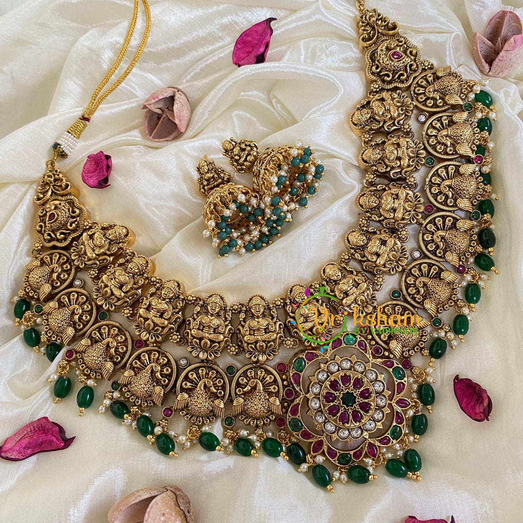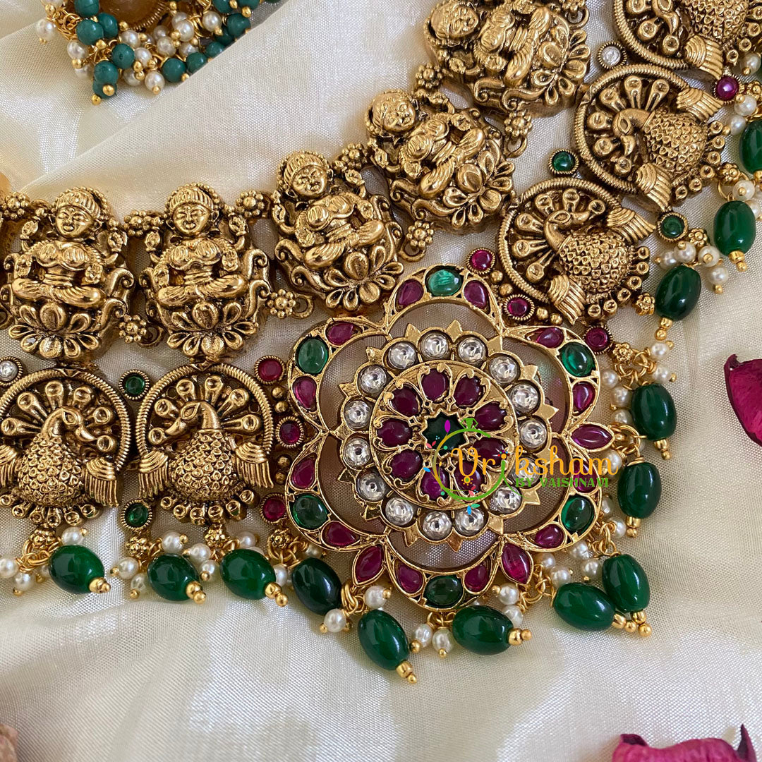 Premium Lakshmi Temple Short Neckpiece -Intricately Designed Layered Temple Choker with Lakshmi idol, peacocks and flowers, comes with matching ear hangings. Green bead Finish.