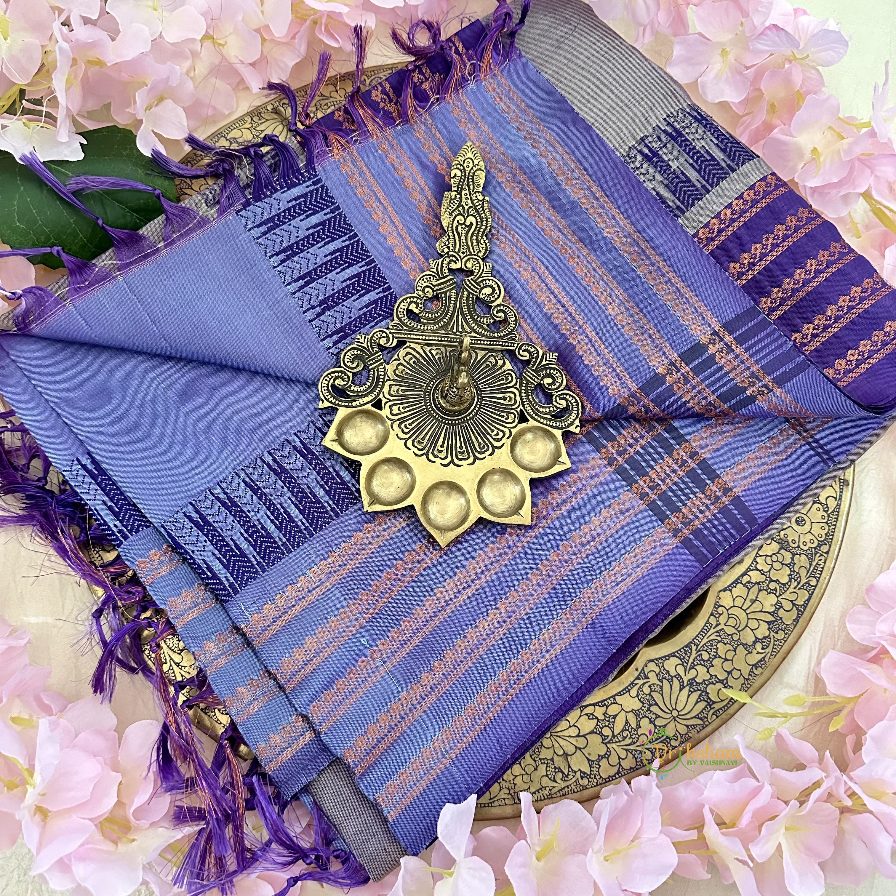Lavender Chinnalampattu Saree with Copper Temple Borderand Blue Pallu -Chinnalampattu sarees are typically handwoven using pure silk threads. The unique feature of these sarees lies in their border designs, which often include intricate patterns inspired by nature, temples, and traditional motifs. The pallu (the loose end of the saree) is also elaborately designed, adding to its elegance. Doesn't come with blouse -Saree only.
