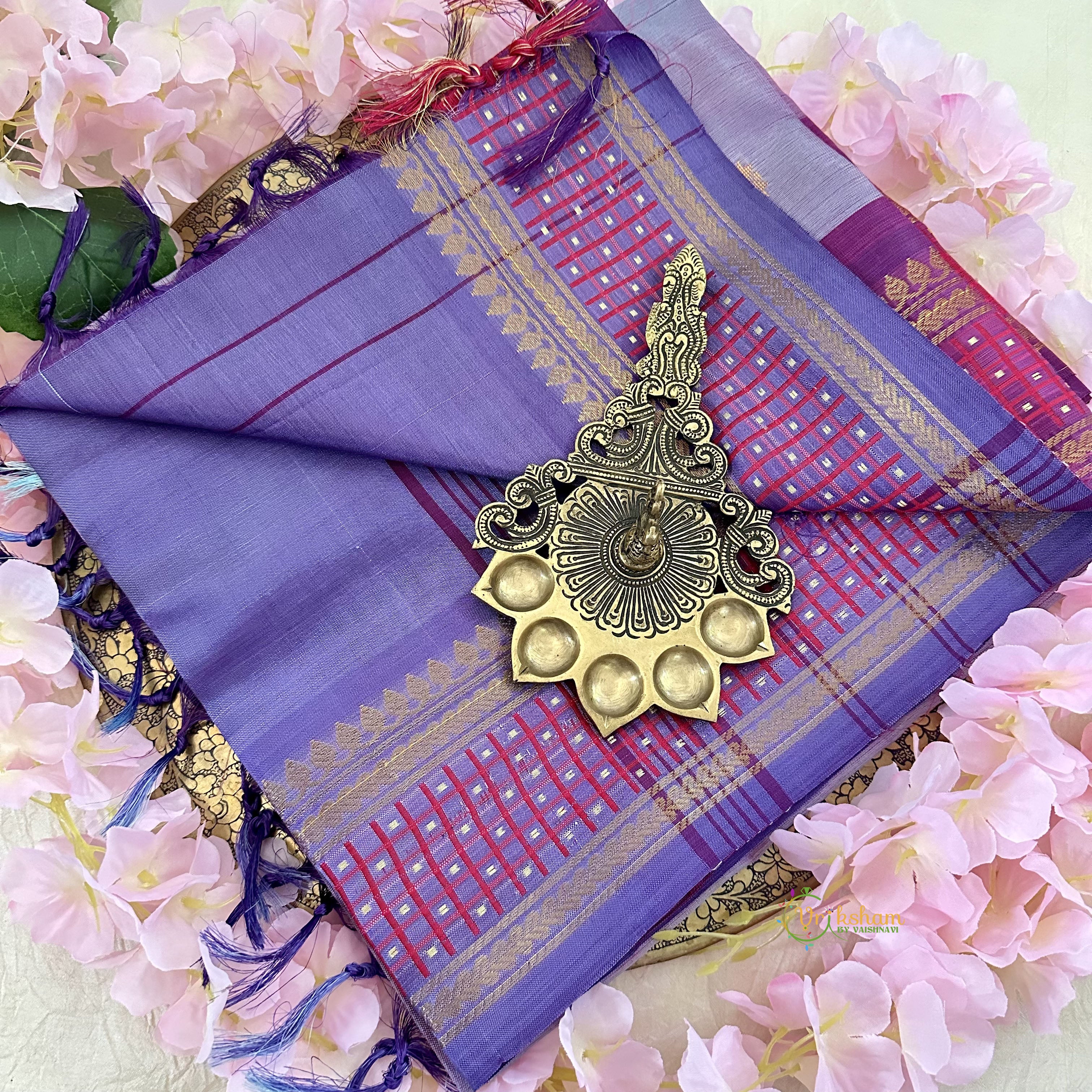 Lavender Chinnalampattu Saree with Pink and Purple Border - Chinnalampattu sarees are typically handwoven using pure silk threads. The unique feature of these sarees lies in their border designs, which often include intricate patterns inspired by nature, temples, and traditional motifs. The pallu (the loose end of the saree) is also elaborately designed, adding to its elegance. Doesn't come with blouse -Saree only.