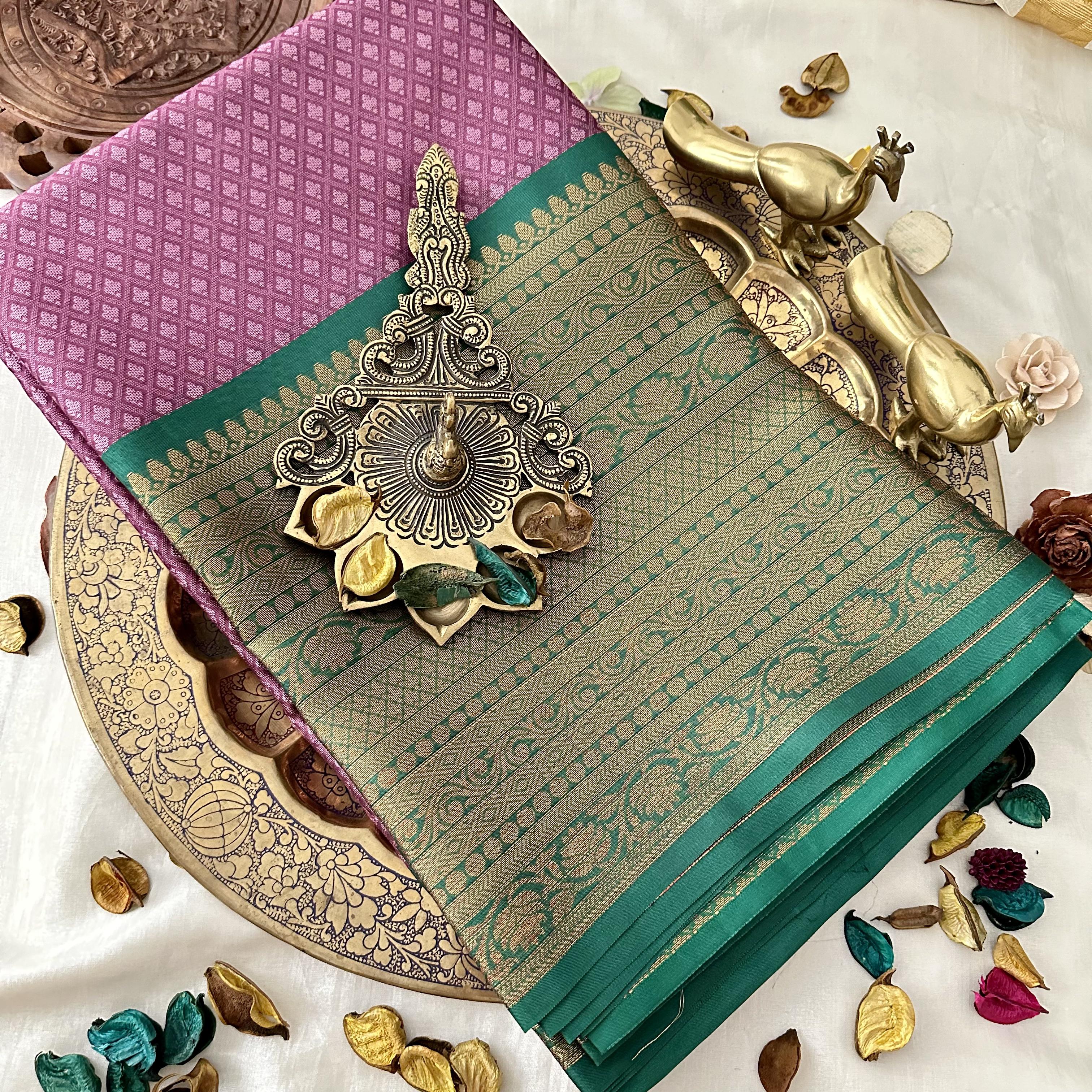 Lavender Color Kora Muslin Saree with Dark Green Border – Festive wear Kora Muslin saree manufactured in Varanasi –designer printed throughout the saree ; comes with Blouse attached.