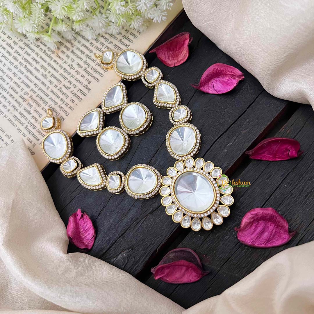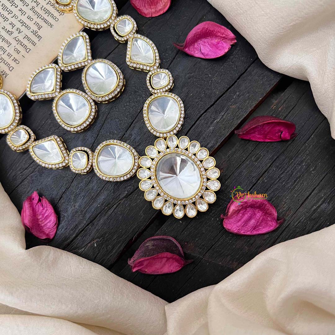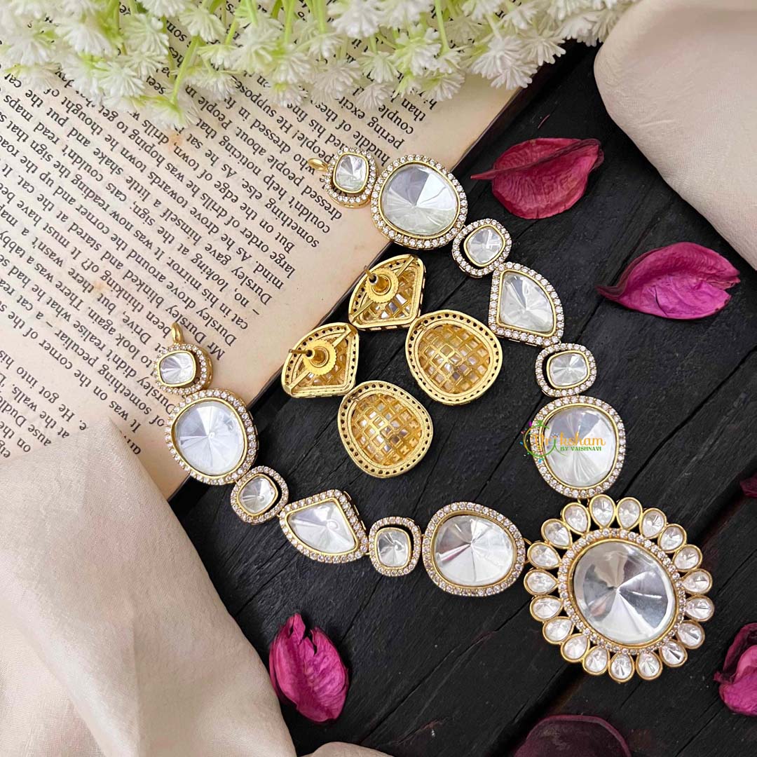 Mossanite Victorian Diamond High Neckpiece WIth Beads -The white Mossanite Victorian Diamond High Neck piece is a breathtaking piece of jewelry that combines elegance with vintage charm. Crafted with exquisite attention to detail, this choker features white mossanite gemstones arranged in a Victorian-inspired design. ; comes with pair of matching earring.