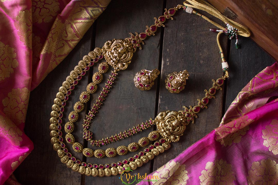 Three layer kemp Lakshmi Gold look alike haaram - Red comes with jhumkas. This piece of jewelery has a unique gold look alike polish and is of premium quality