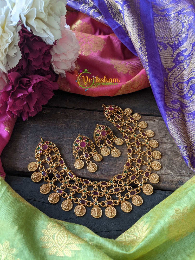 Layer Lakshmi Coin Premium Choker -Red Green –NO PENDANT – AD Stone set; lakshmi coin/kaasu along the length of the neckpiece. Comes with matching danglers.