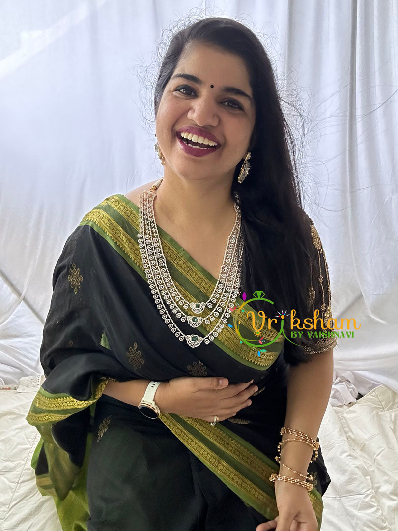 Bridal Layered American Diamond Haram- Green stone pendant and matching earrings. White tone polish long neckpiece.