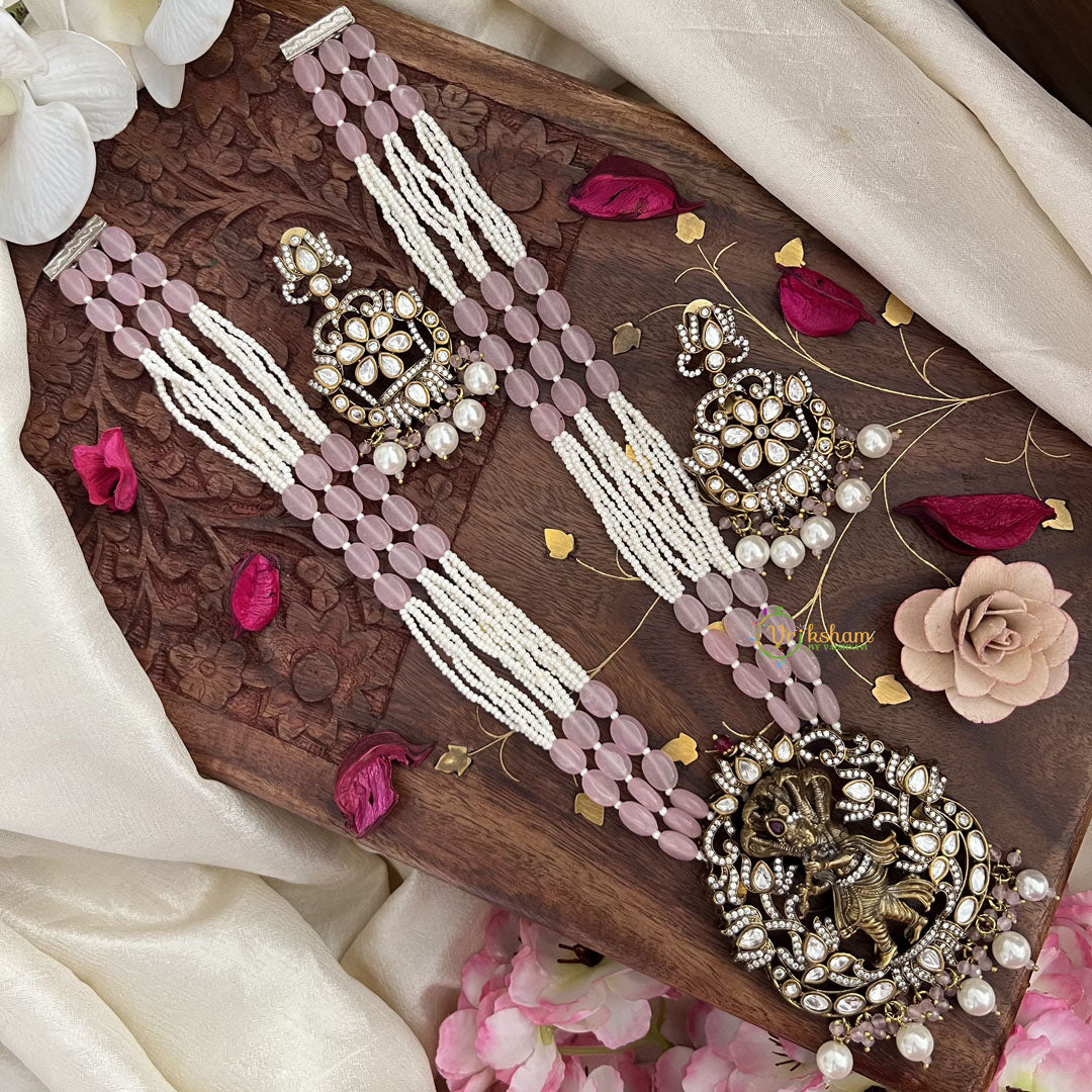 Layered Beaded Light Pink Victorian Diamond Short Neckpiece- semi precious stone and white AD stone studded pendant royal jewelry; comes with matching earrings.