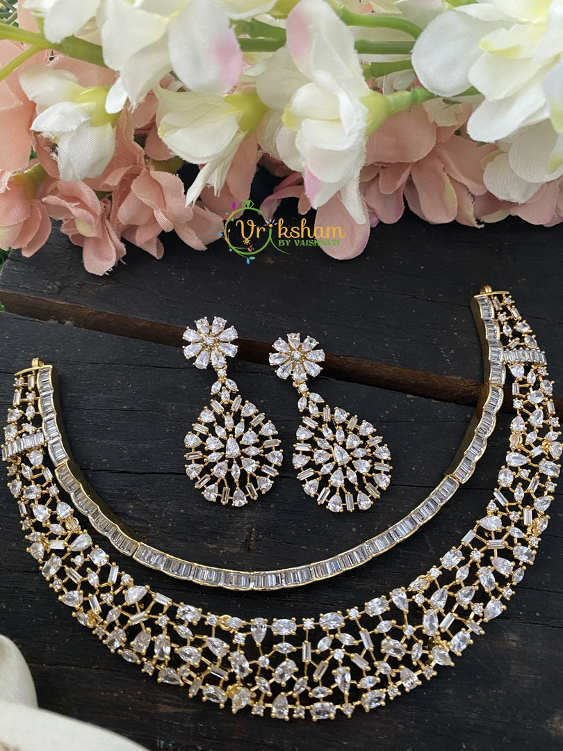 Filigree American Diamond Choker -Gold Tone american diamond jewelery with full white stone -set of high neck choker, ear danglers .