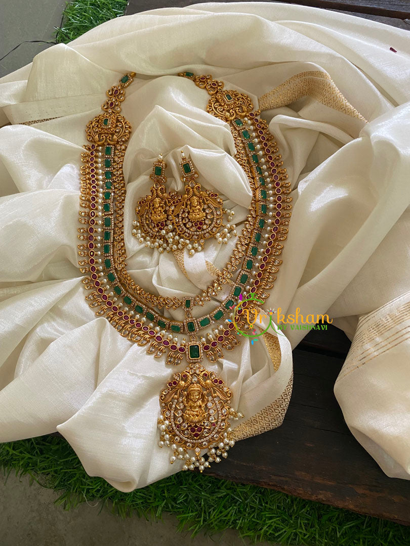 Premium 3 Layered Lakshmi Haram with Mugappu – red green and white AD stone studded Long neckpiece with lakshmi coins and mugappu, comes with matching lakshmi danglers.