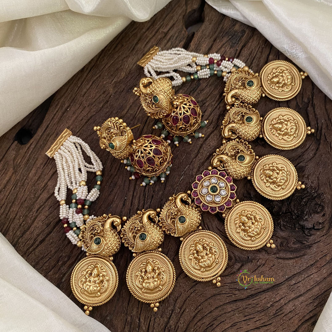Enchant and dazzle with this exquisite Layered Pearl Lakshmi Coin AD Stone Peacock Choker Short Neckpiece! Expertly crafted using premium quality polish and imitation stones, this stunning neckpiece is the perfect addition to any jewelry collection. Don't miss out on the matching earrings that come with it. Elevate your style and embrace the elegance and beauty of this one-of-a-kind choker.