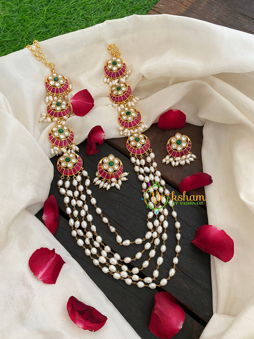 Layered Pearl Malai with Chandhbali Pendants-Pink green and white stone studded lakshmi idol pendants on both sides of the malai neckpiece.