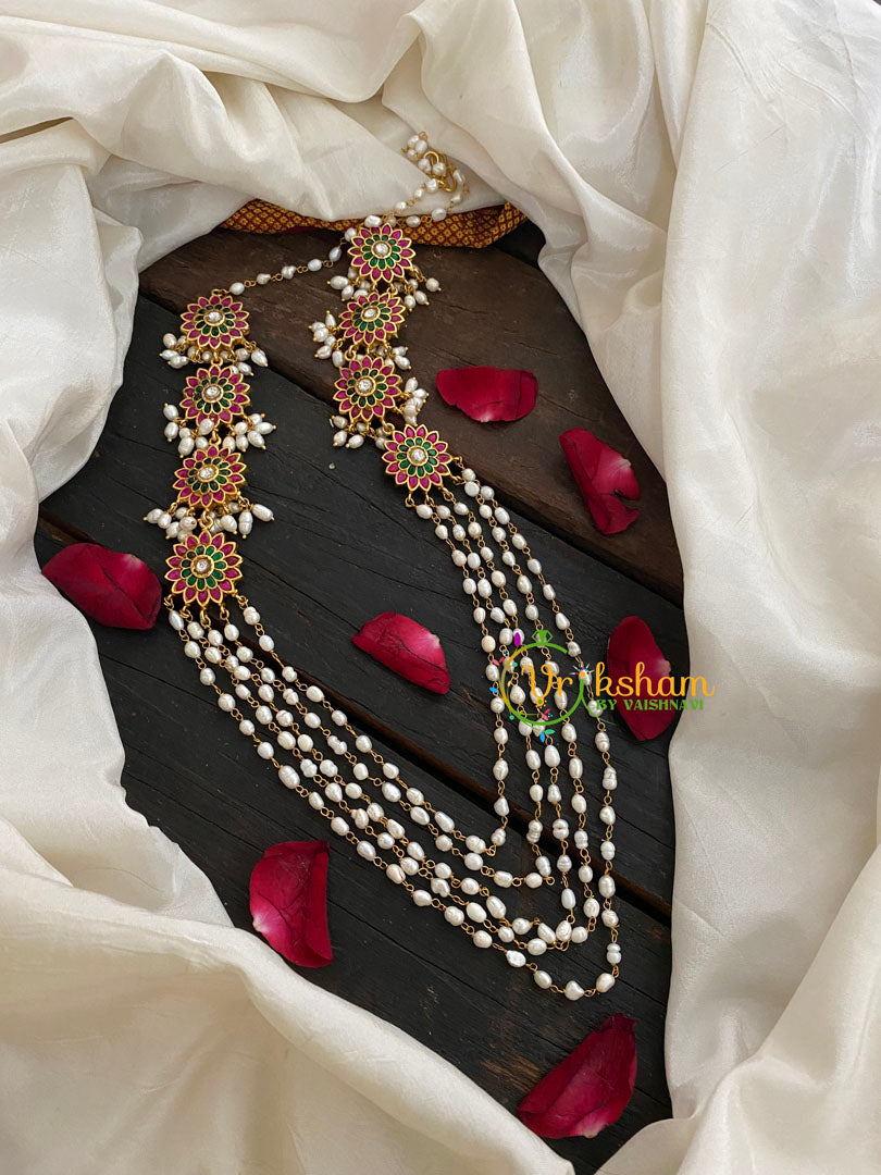 Layered Pearl Malai with Floral Pendants-Pink green and white stone studded lakshmi idol pendants on both sides of the malai neckpiece.