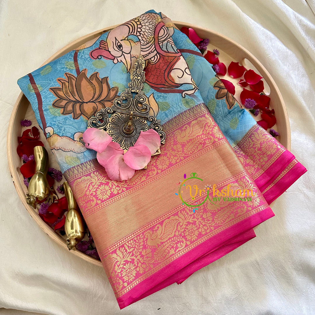 Light Blue Kalamkari Saree –Semi Soft Silk Saree- Festive wear saree – kalamkari print work throughout the saree; comes with Blouse attached. Two side traditional kanchi border.