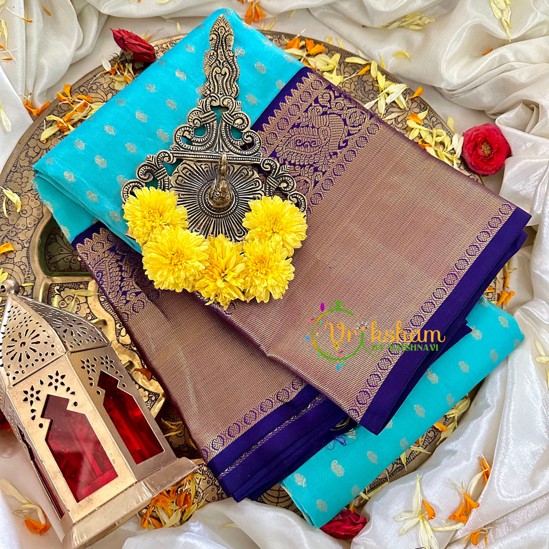 Light Blue Kanchi Pure Silk Saree- Festive wear kanchi silk saree – smaller butta pattern throughout the saree; comes with Blouse attached. Handloom Silk.