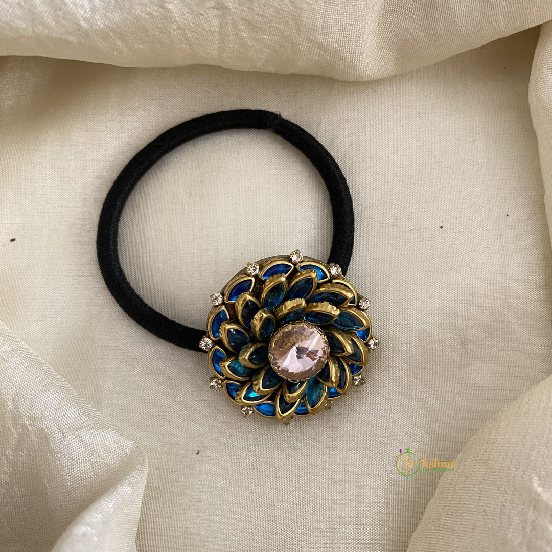 Light Blue, Pink Kundan Pendant Rubber Band - Flower - semi precious stone -Festive Wear Hair bands-premium gold like polish pendant.
