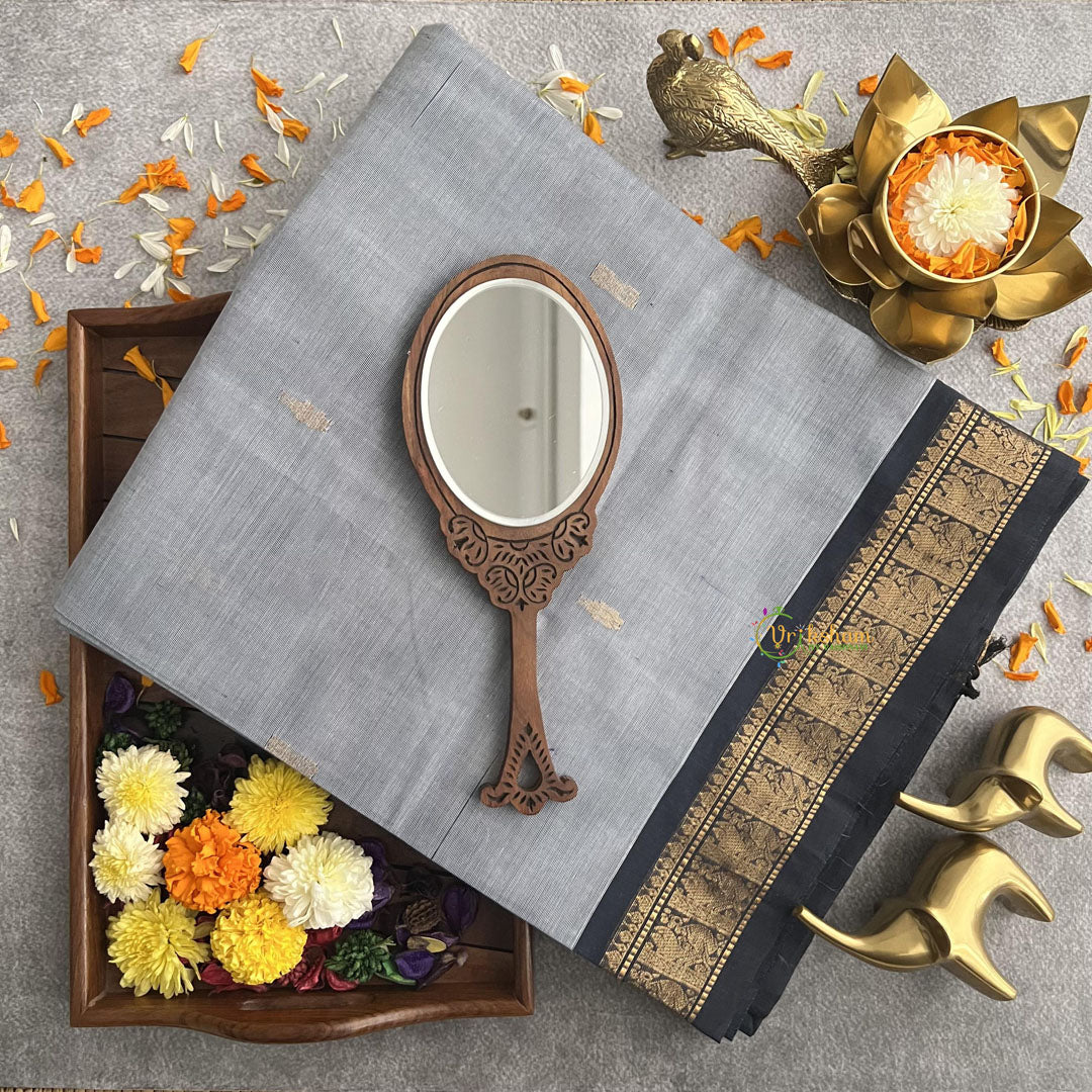Light Grey Kanchi Cotton Saree with Double Golden Border - Handloom - Drape elegance - Introducing our Light Grey Kanchi Cotton Saree, a testament to understated elegance and comfort. Its soft cotton fabric ensures a comfortable drape, making it ideal for all-day wear. Adding a touch of sophistication, the golden border frames the saree, elevating its charm with a subtle hint of opulence. Perfect for casual as well as for special occasion.