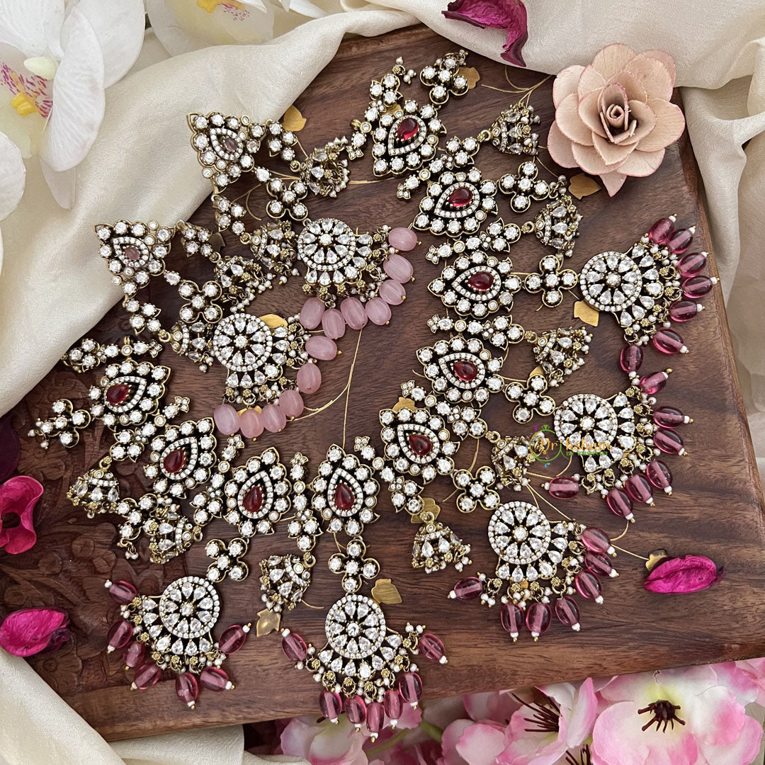 Light Pink Victorian Diamond Pendant Choker Short Neckpiece-color and white precious stone studded royal jewelry; comes with matching earrings.