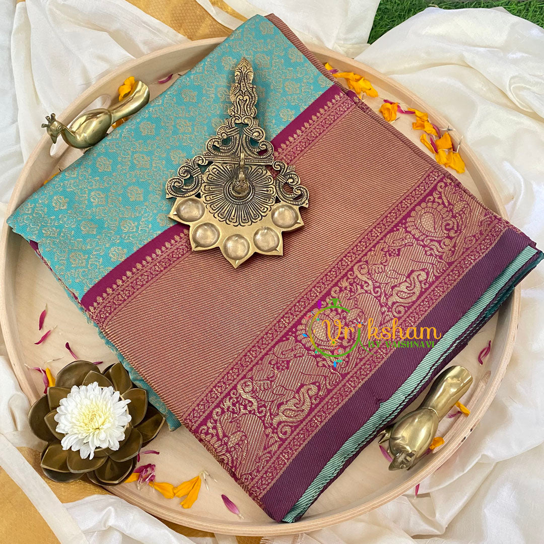 Light Teal Blue Litchi Silk Saree- Festive wear saree – Self design pattern throughout the saree; comes with Blouse attached. Contrast purple border.