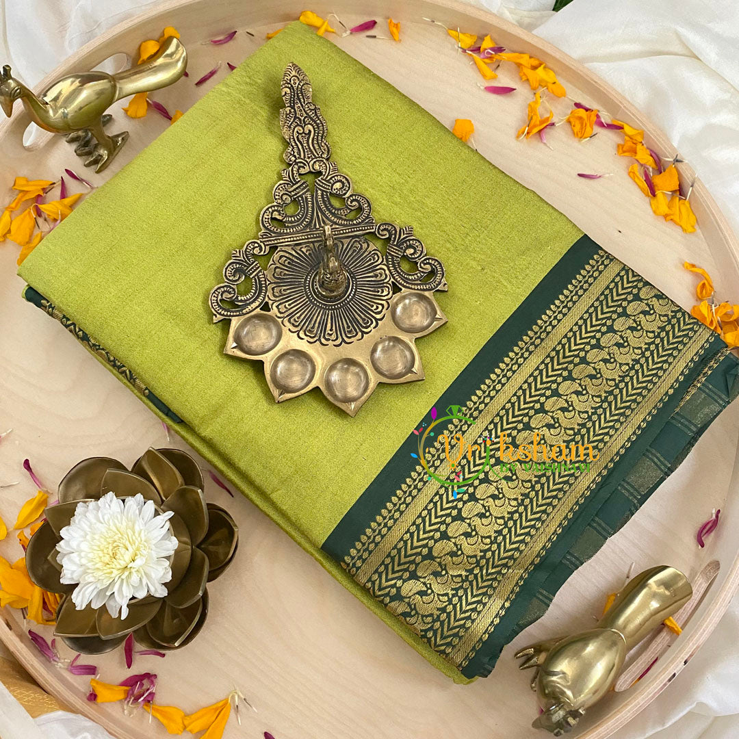 Lime Green Litchi Silk Saree- Festive wear saree – Plain pattern body throughout the saree; comes with Blouse attached. Contrast dark green border and pallu.