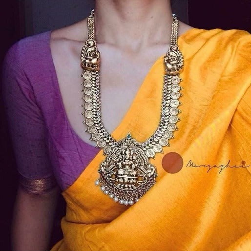 A very beautiful and Premium quality neck piece with a big Lakshmi pendant looks gold alike with pearl embellishments