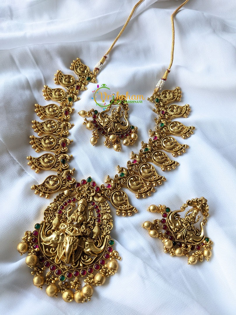 Maanga and Lakshmi Pendant Neckpiece -Red Green stone Temple jewelery -short neckpiece; comes with matching maanga danglers.