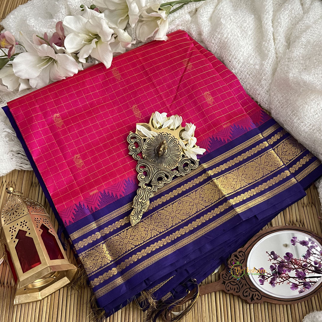Introducing our beautiful Magenta with Purple Border Korvai Silk Cotton Saree, handloomed with intricate golden thread work on border and adorned with checks and butta design all over saree. Elevate your traditional wardrobe and add a touch of elegance to any occasion. Made from a comfortable silk cotton blend, this saree offers both style and comfort.