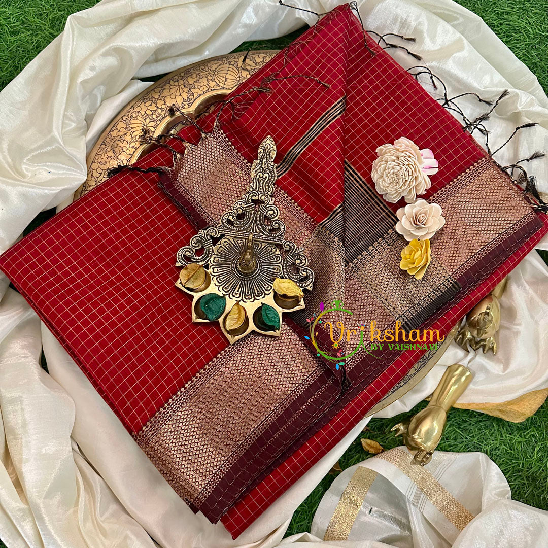 Red Kattam Maheshwari Silk Cotton Saree - Festive wear saree ; comes with Blouse attached. Two side border and pallu.