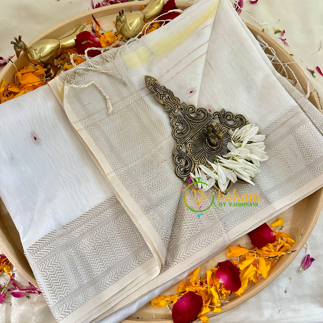Cream White Maheshwari Silk Cotton Saree - Festive wear saree ; comes with Blouse attached. Two side contrast border and pallu.