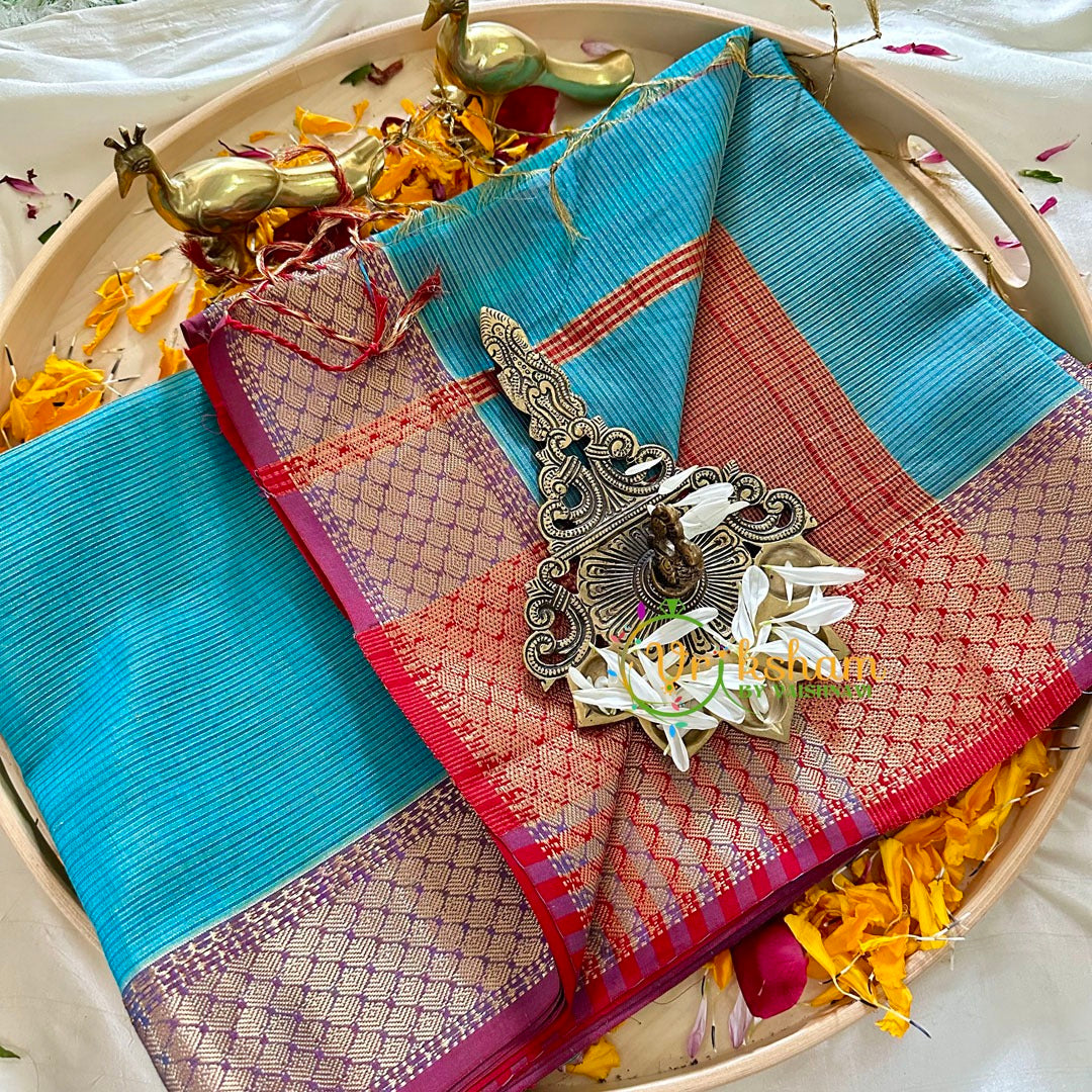 Sea Blue Maheshwari Silk Cotton Saree - Festive wear saree ; comes with Blouse attached. Two side contrast border and pallu.