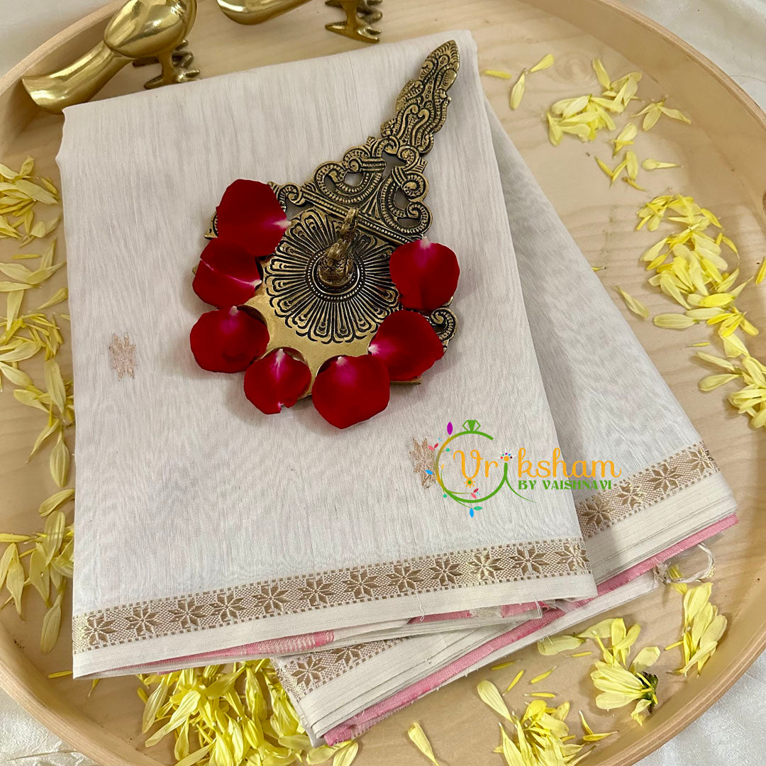 White Maheshwari Silk Cotton Saree - Festive wear saree ; comes with Blouse attached. Two side contrast border and pallu.