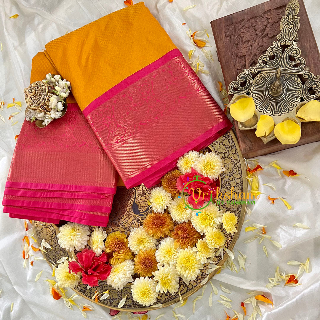 Mango Yellow Kanchi Silk Saree with Pink Border - Kanchi Silk Saree – Festive wear silk saree – saree; comes with Blouse attached. Power loomed saree.