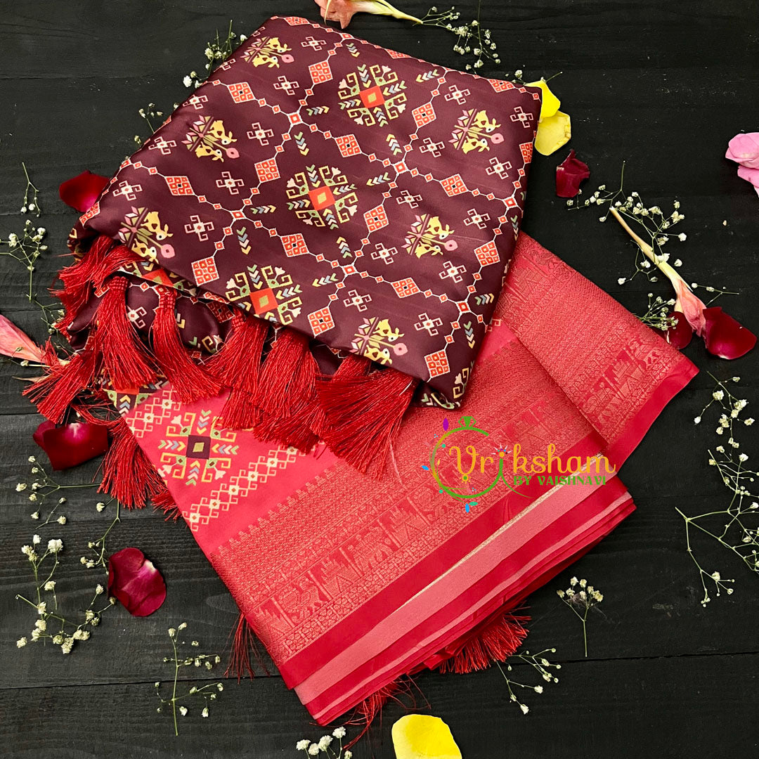 Maroon Patola Semi Soft Silk Saree - with traditional border - Pattern throughout the saree; comes with Blouse attached. Two side contrast border and pallu.