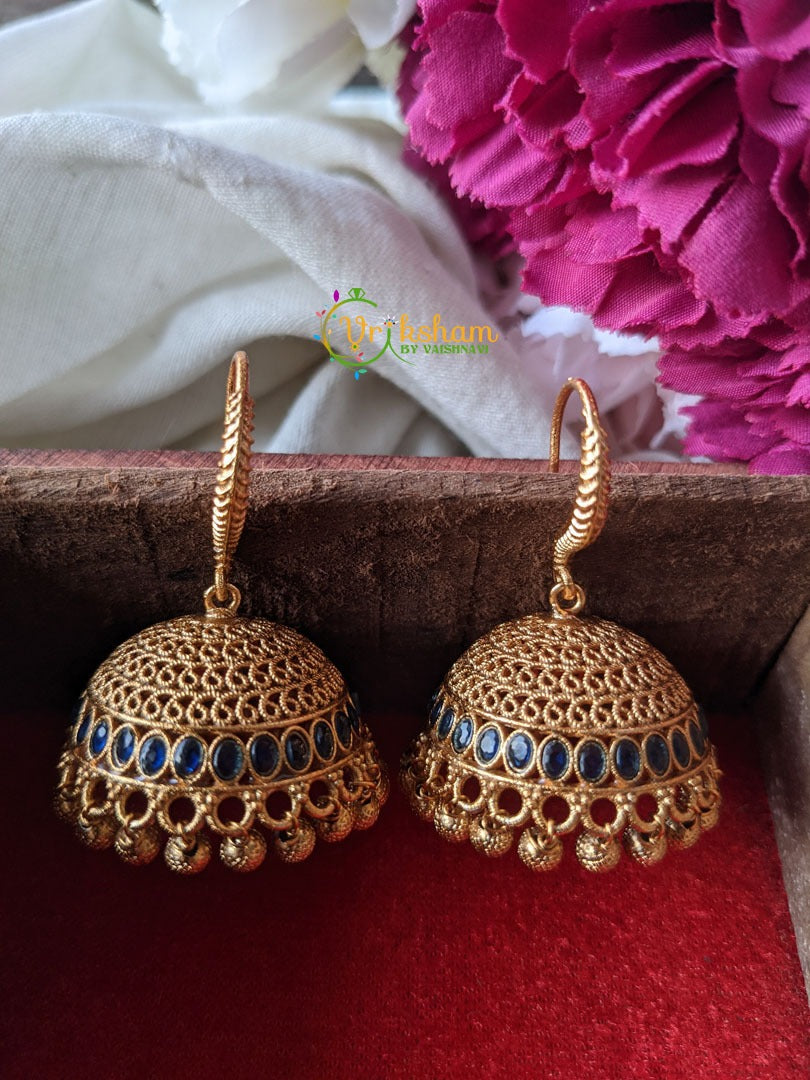 Matt Gold Hook Jhumkas with bottom blue stone set.