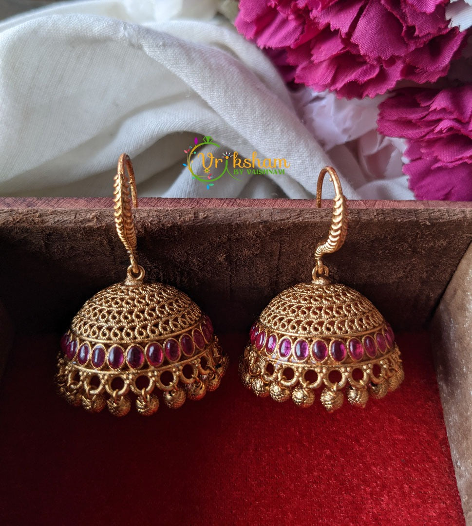 Matt Gold Hook Jhumkas with bottom red stone set.