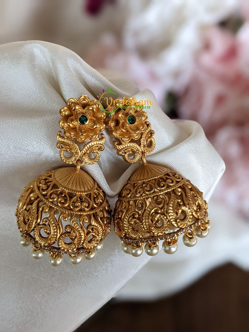 Matt peacock Jhumkas -Filigree jhumkas -Budget jhumkas with matt polish with pearl finish.