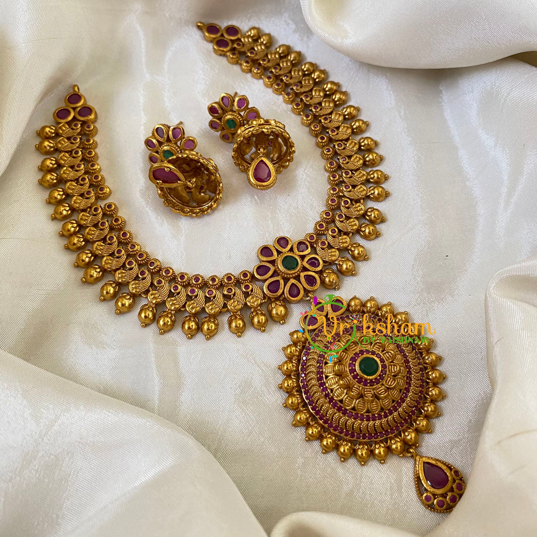 Premium Matt Pendant Short neckpiece - neckpiece with Centre Round Pendant and stone studded paisley maanga design along the length of the neckpiece, comes with matching jhumkas.