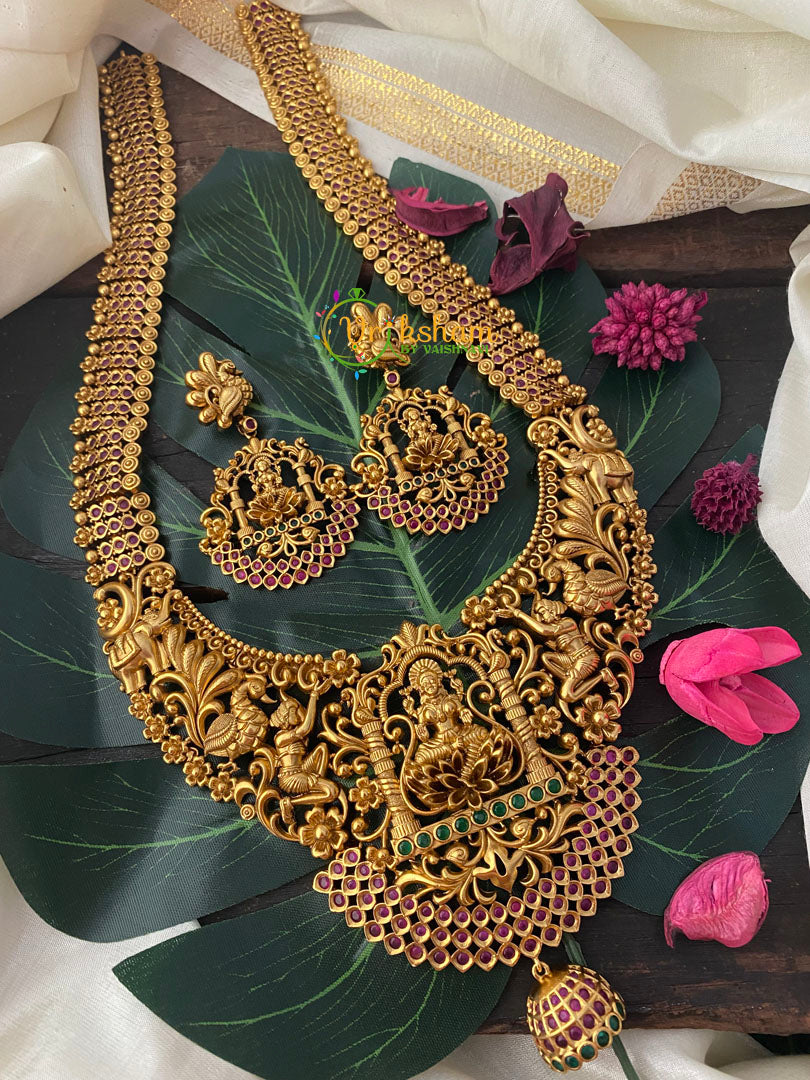 Premium Matt Temple Haram -Lakshmi Haram -Red green and white AD imitation stone studded long neckpiece, comes with matching ear hangings.