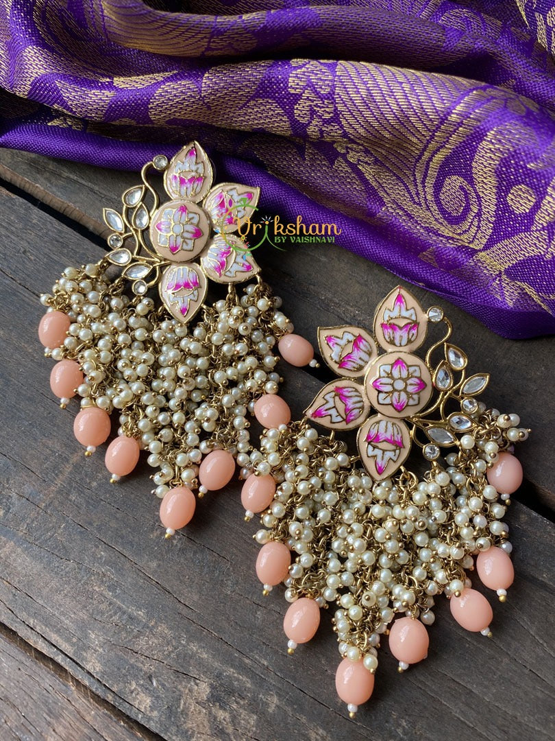 Meenakari cluster pearl earrings - Handmade ; Festive, grandeur looking, pale orange color earring with cluster pearls and pale orange bead ends.