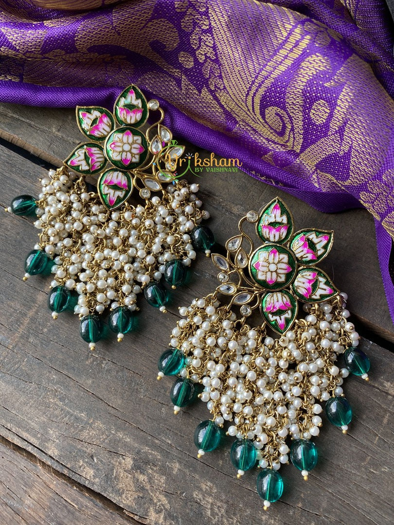 Meenakari cluster pearl earrings - Handmade ; Festive ,grandeur looking, bottle green color earring with cluster pearls and bottle green bead ends.