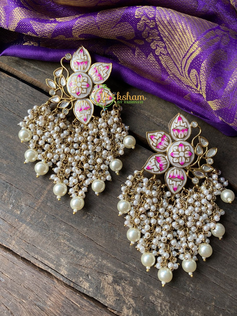 Meenakari cluster pearl earrings - Handmade ; Festive ,grandeur looking, white color earring with cluster pearls and white bead ends.