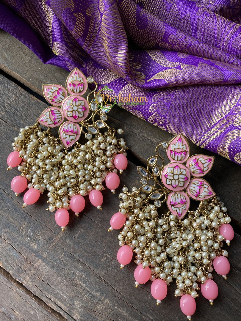 Meenakari cluster pearl earrings - Handmade ; Festive ,grandeur looking, pink color earring with cluster pearls and pink bead ends.