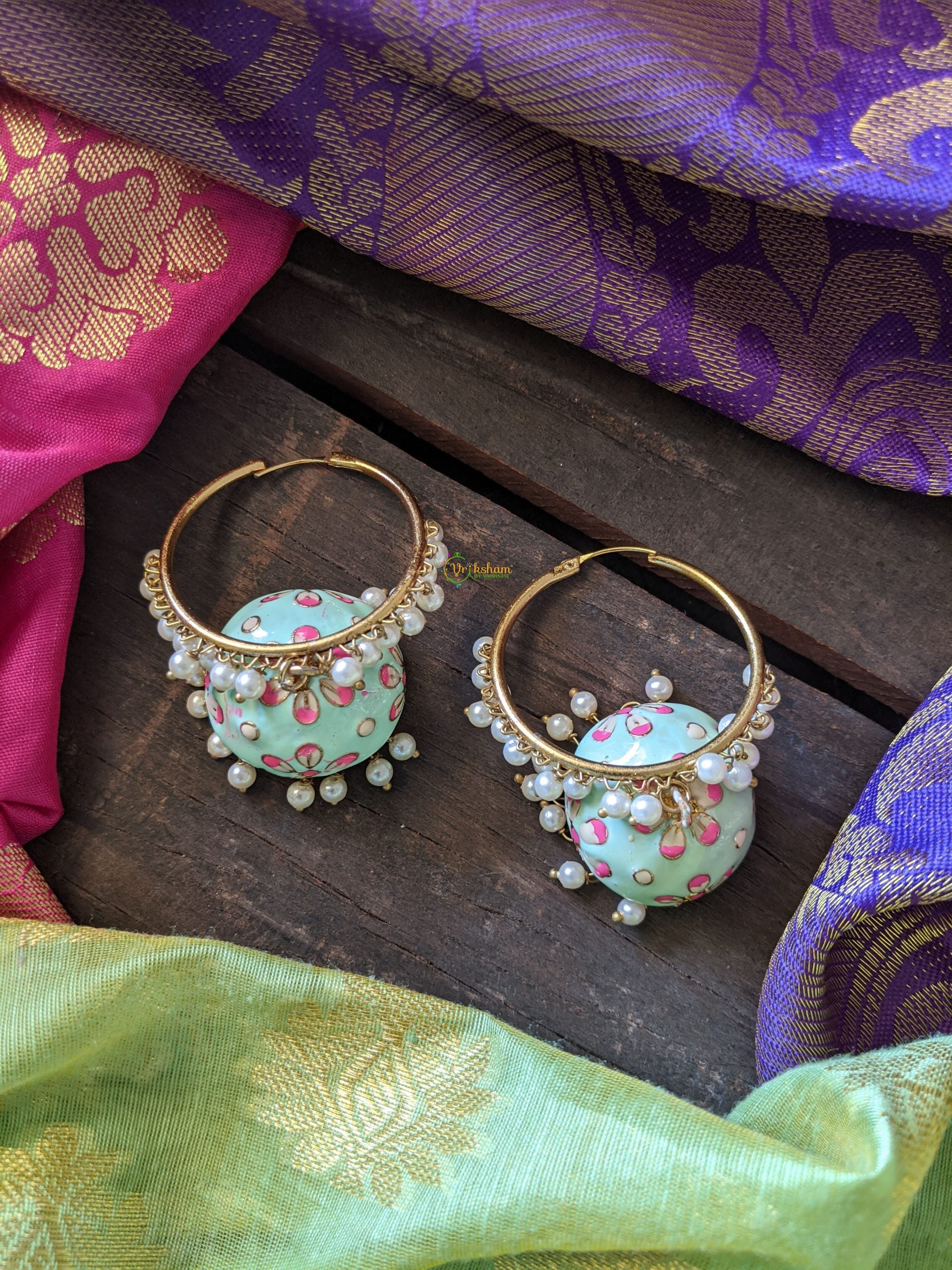 Meenakari Jhumkas -Loop Ring with Jhumka -Green jhumkas with pink flower pattern. Light weight meenakari work.