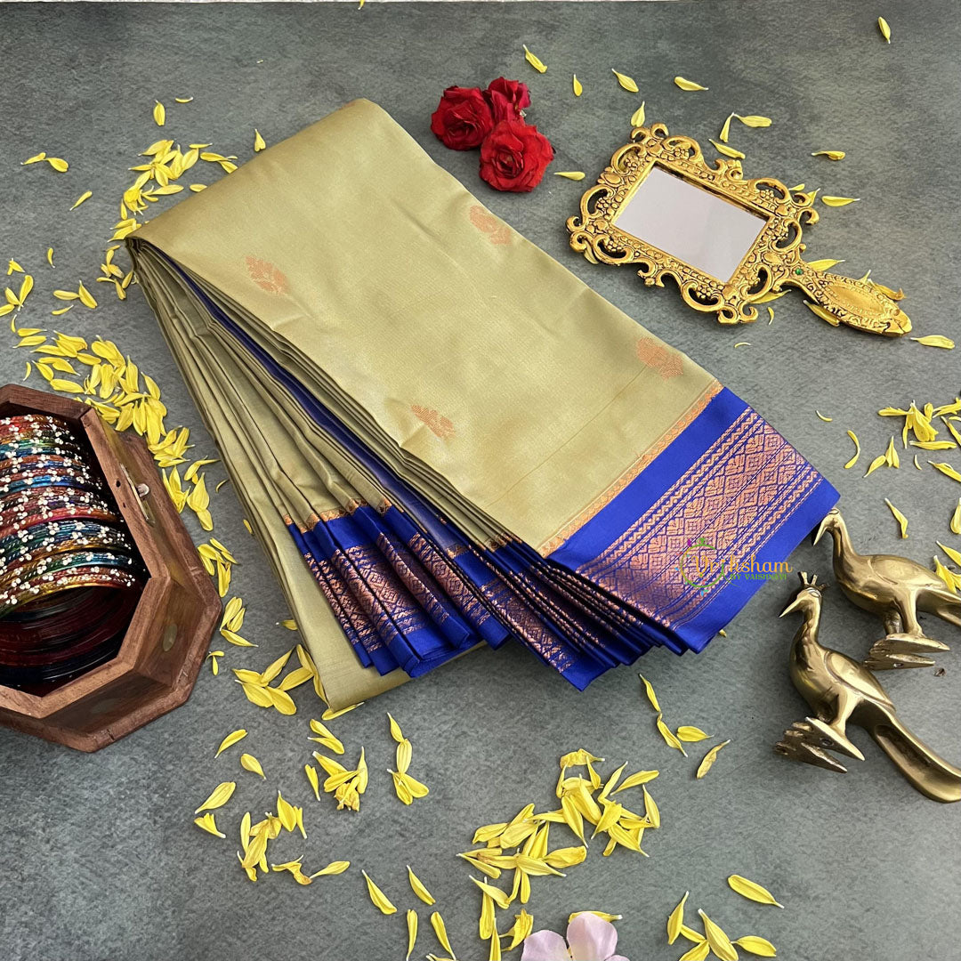 Mehendi Color with Blue Border Semi Soft Silk Saree– with traditional border –Small Butta Pattern throughout the saree; comes with Blouse attached. Two side same size contrast border.